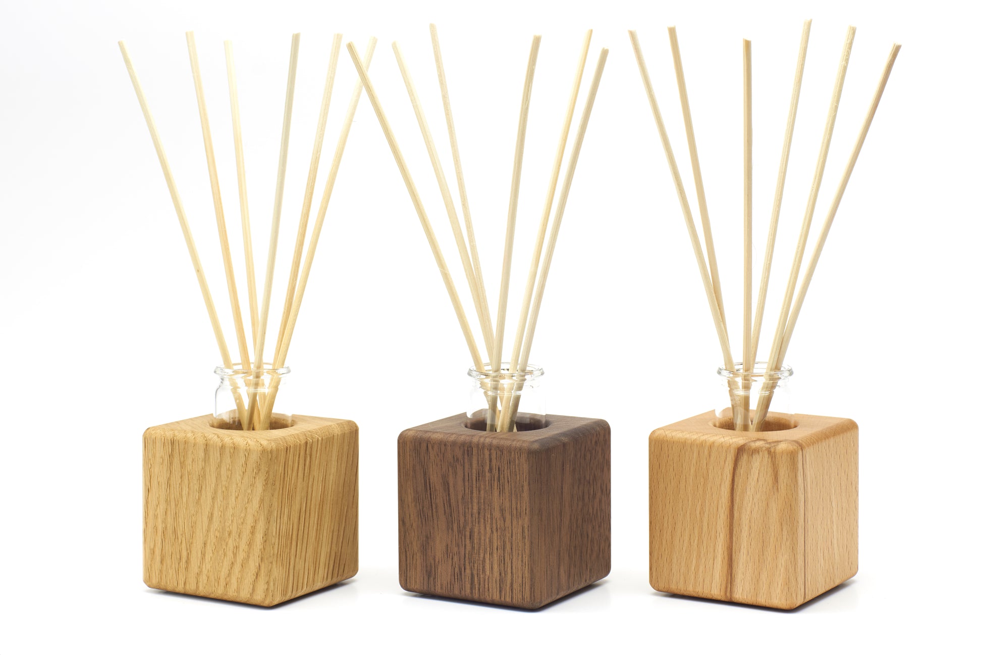 Schicke Vase aus Massivholz inklusive Duftöl und Rattanstäbchen