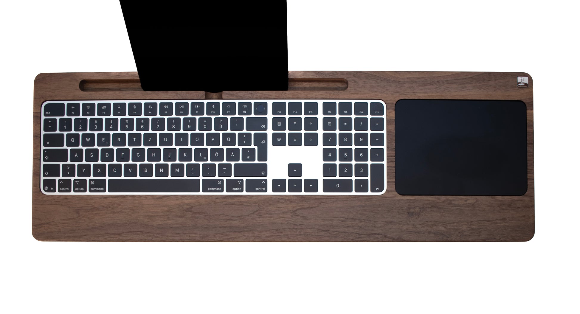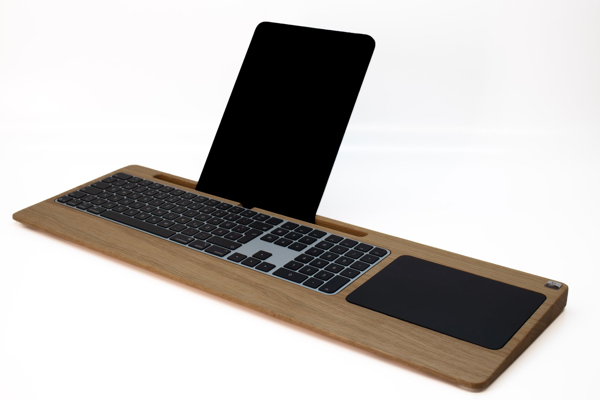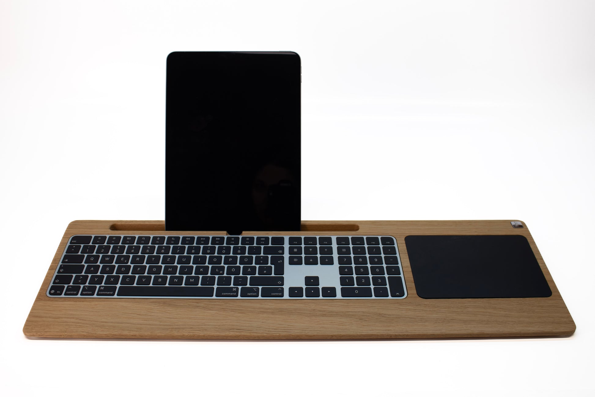 Der Numeric CombiTray ist ein präzisionsgefertigter Träger für die Apple's iPad (Pro, Air und mini), die Magic Tastatur mit Ziffernblock und Touch ID (ab 2021) und das Magic Trackpad (ab 2021). Für diejenigen, die manchmal am Computer und manchmal am iPad arbeiten, bietet unser Numeric CombiTray eine Verbindung von TrackpadTray und TabletTray. Das sanfte Naturmaterial umschließt die harten Aluminiumkanten der drahtlosen Peripheriegeräte und gewährt dadurch sowohl ergonomische, als auch optische Vorzüge. Als Standard bieten wir eine rechtshändig ausgerichtete Version mit der Magic Tastatur links und dem Magic Trackpad rechts an. Die Fertigung eines linkshändigen Numeric CombiTray ist jedoch kein Problem - kontaktieren Sie uns bitte einfach direkt.