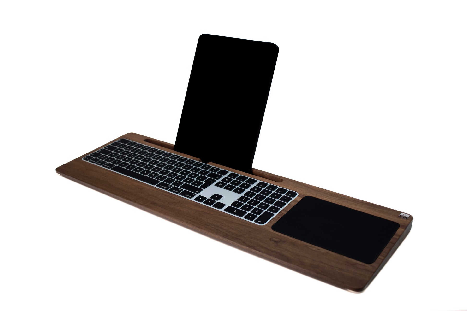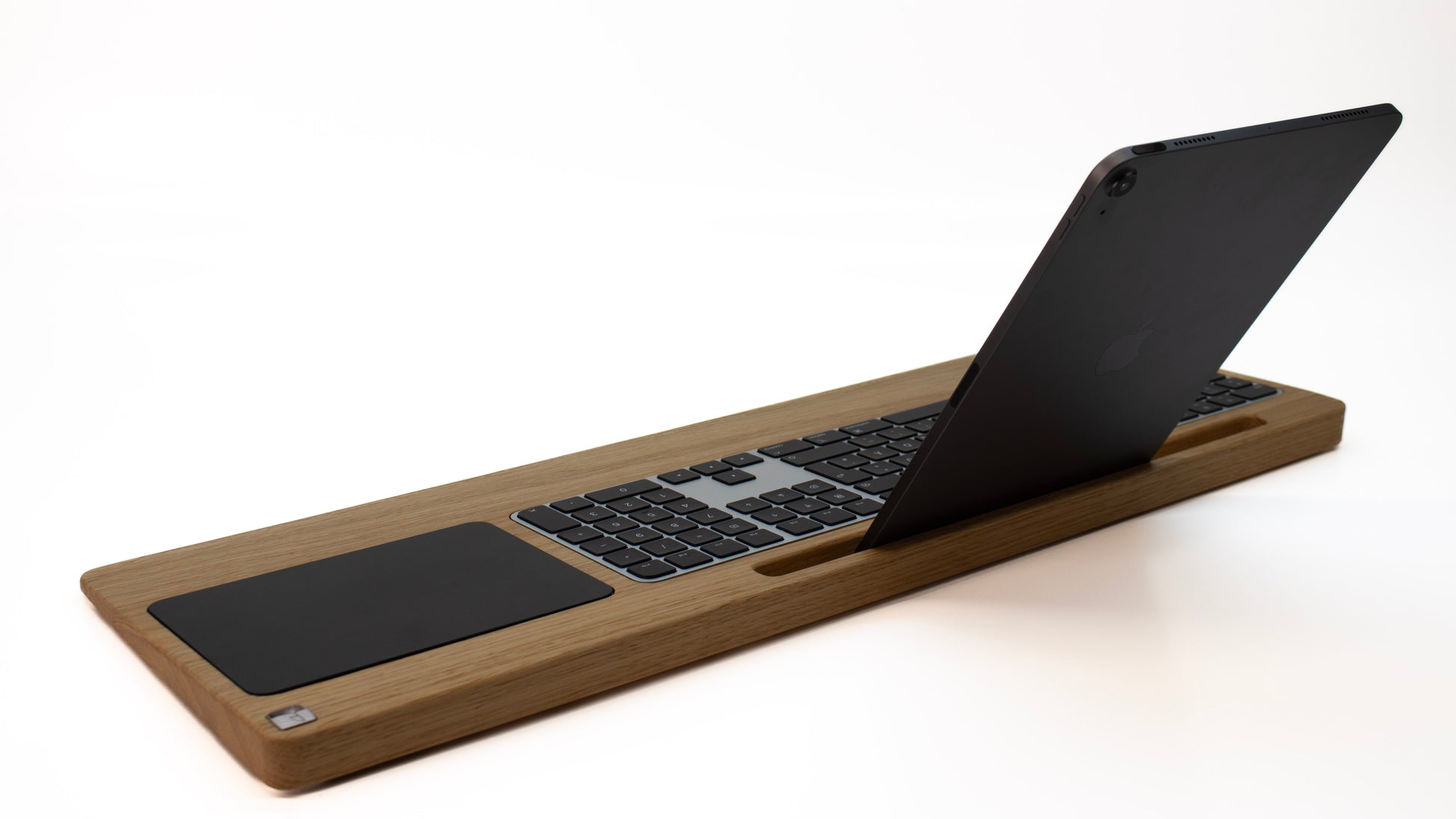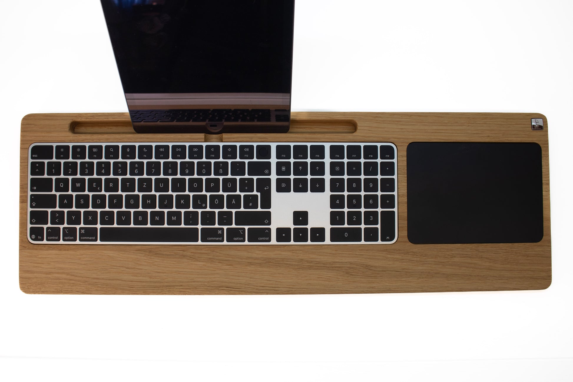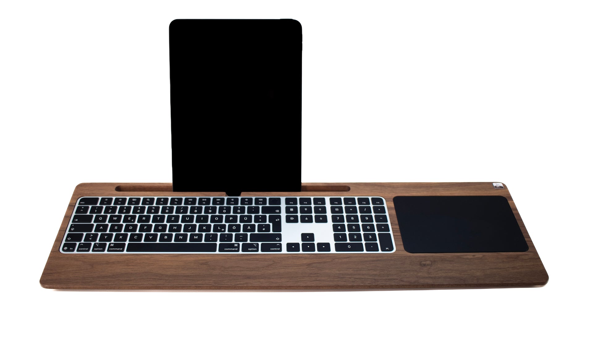 Der Numeric CombiTray ist ein präzisionsgefertigter Träger für die Apple's iPad (Pro, Air und mini), die Magic Tastatur mit Ziffernblock und Touch ID (ab 2021) und das Magic Trackpad (ab 2021). Für diejenigen, die manchmal am Computer und manchmal am iPad arbeiten, bietet unser Numeric CombiTray eine Verbindung von TrackpadTray und TabletTray. Das sanfte Naturmaterial umschließt die harten Aluminiumkanten der drahtlosen Peripheriegeräte und gewährt dadurch sowohl ergonomische, als auch optische Vorzüge. Als Standard bieten wir eine rechtshändig ausgerichtete Version mit der Magic Tastatur links und dem Magic Trackpad rechts an. Die Fertigung eines linkshändigen Numeric CombiTray ist jedoch kein Problem - kontaktieren Sie uns bitte einfach direkt.